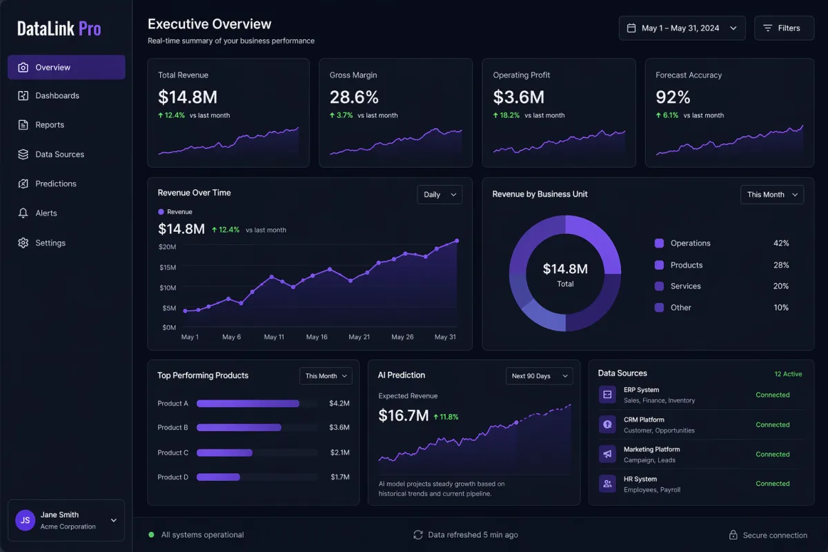 Unify every data source across your organization into one intelligent reporting hub with AI predictions, real-time accuracy, and enterprise-grade security.